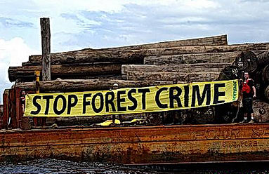 Java Sea, Indonesia – 15 February 2004 – Greenpeace activists from the UK, the Philippines, the USA and Papua New Guinea display a banner with the message » Stop Forest Crime» on a log barge off the coast of central Kalimantan February 15, 2004. Greenpeace is now on patrol in Kalimantan documenting the continuing destruction of the region’s forests, while governments discuss the future of Life on Earth at the Convention on Biological Diversity in Kuala Lumpur. About 80 % of Indonesia’s timber exports are illegal. Important markets such as China, the EU and the USA import illegal rainforest timber. Producer countries as Papua New Guinea and Indonesia are being logged illegally because of the demand for timber and the lack of proper enforcement of Forestry legislation. Greenpeace/Natalie Behring-Chisholm