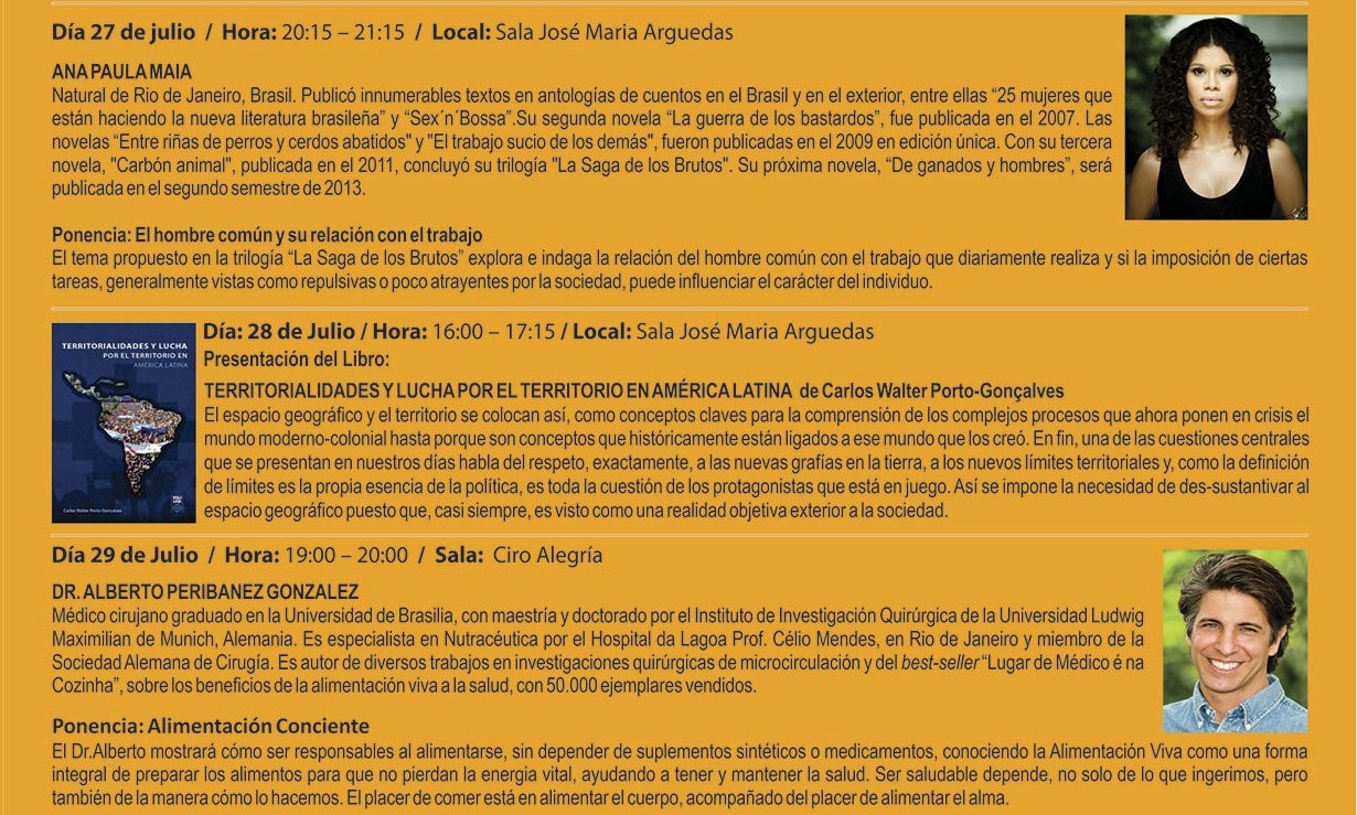 Desde la apertura el 19 de Julio, fueron cuatro las ponencias que Brasil presentó, una de filosofía ‘Filosofía como dialogo en la obra de Agustín de Hipona’ a cargo de Moacyr Novaes, Doctor por la Universidad de Sȃo Paulo; sobre política, ‘Euclides Da Cunha y la política externa brasileña al inicio del siglo XX: las relaciones entre Brasil y Perú’ en voz del diplomático Kassius Diniz Da Silva Pontes, también el diplomático Eduardo Pereira e Ferreira expuso acerca de ‘Reflexiones sobre la traducción de la Literatura’, tema que le compete pues es traductor y periodista; el compositor de música popular y escritor Nei Lopes desarrolló ‘El samba brasileño y la música afro en América’ y el show afrolatino en la Noche de Brasil; la música de Paulo Bi, con la poesía de José Paulo Paes interpretaron el show infantil ‘De padres para hijos’.