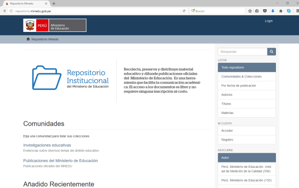 Los documentos están agrupados en 2 colecciones. Una tiene más de 4 mil 500 investigaciones, en su mayoría publicadas por instituciones nacionales e internacionales, y la otra reúne 800 publicaciones del Minedu. El acceso al Repositorio Institucional es muy sencillo, solo hay que ingresar a http://repositorio.minedu.gob.pe/, o también se puede entrar desde el buscador Google. El acceso es libre y no es necesario registrarse, hacer algún pago o tener contraseña.