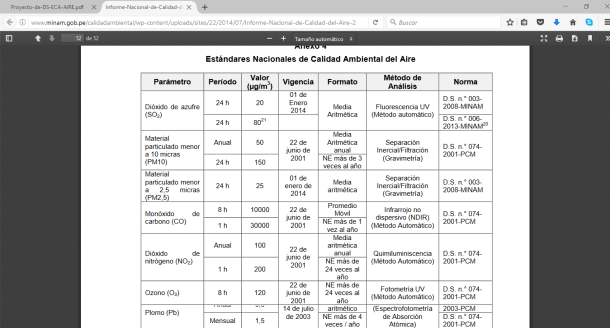 Estándar de Calidad Ambiental, ECA, para el aire en Perú 2013-2014.