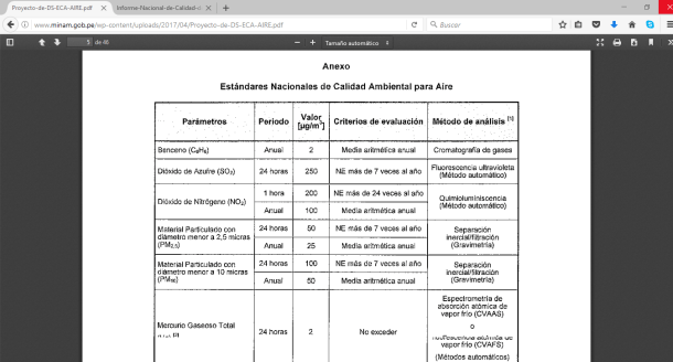 Estándar de Calidad Ambiental, ECA, para el aire en Perú 2017.