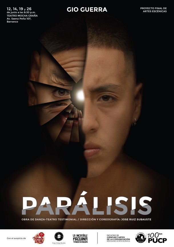 PARÁLISIS es el unipersonal de Danza-Teatro testimonial montado como proyecto final de Gio Guerra, actual alumno de la especialidad de Artes Escénicas de la PUCP bajo la dirección de José Ruiz Subauste en sus dos últimas presentaciones, el 19 y el 26 de Junio a las 8:30 p.m. en el Teatro Mocha Graña (Av. Saenz Peña 107, Barranco).