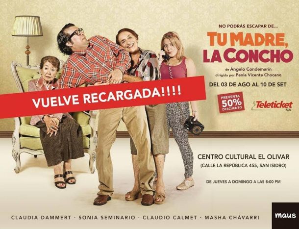 “Tu madre, la Concho” va desde el 03 de Agosto hasta el 10 de Setiembre del 2017 en el Centro Cultural El Olivar (Calle La República 455, San Isidro). Las funciones son de Jueves a Domingo a las 8 de la noche. Entradas a la venta en Teleticket. General 50 soles, Jubilados 40 soles, Estudiantes 30 soles. Hay preventa hasta 02 de Agosto.
