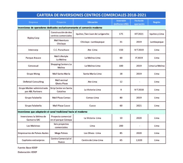El Instituto de Economía y Desarrollo Empresarial (IEDEP) de la Cámara de Comercio de Lima, ha identificado quince proyectos relacionados a nuevos centros comerciales (CC) por US$1.055 millones para los próximos cuatros años.