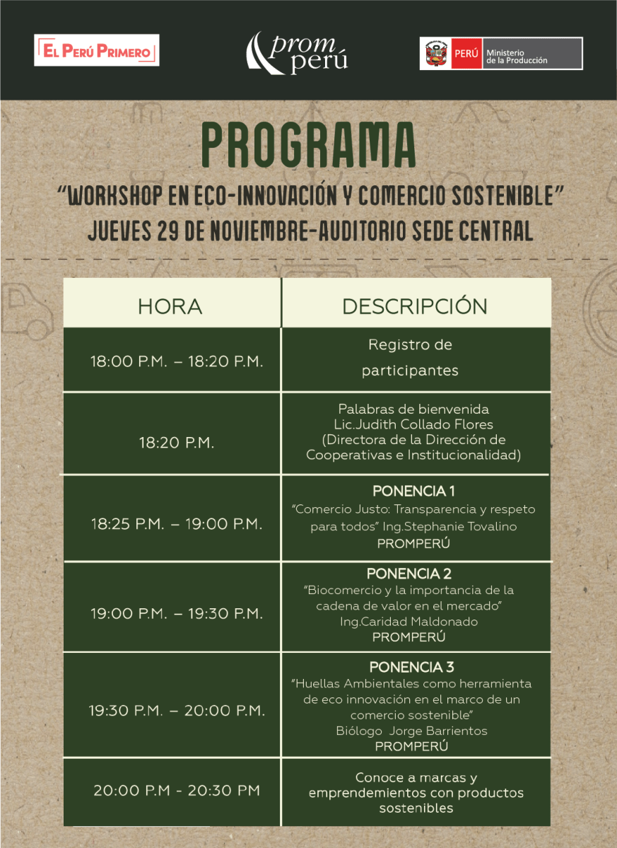 Programa Taller en Ecoinnovación y Comercio Sostenible organizado por el Ministerio de la Producción Publicado noviembre 28, 2018 en 1135 × 1560 en Taller en Ecoinnovación y Comercio Sostenible organizado por el Ministerio de la Producción ← Anterior