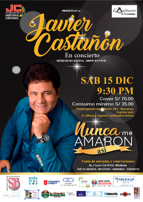 Con sus 39 años de trayectoria en el mundo de la música, Javier Castañón se prepara para deleitar a su público con un gran concierto titulado NUNCA ME AMARON ASÍ, con lo mejor del entrañable repertorio internacional, como: “Mary es mi amor”, “Te he prometido”, “Nunca me amaron así”, “Como no voy a quererte”, entre otros, acompañado de un excelente marco musical compuesto por 9 músicos en escena: 2 Pianos, Saxo & Flauta Traversa, Percusión, Batería, Guitarra, Bajo, trompeta y 2 Coros.