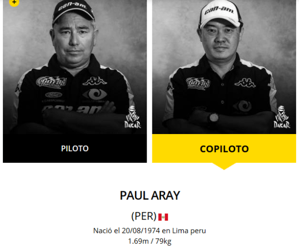 Jose Salaverry representa a Can-Am en Perú, marca que le introdujo al manejo de quads y el off road. Le apasiona el mar, el surf y el buceo, pero desde que descubrió el desierto y sus posibilidades, ha tenido que dividir su tiempo entre el agua y la arena. A su lado estará Paul Aray, experimentado piloto que, junto con el equipo de Ruta 4×4, participó en el Dakar de 2013. Navega dunas desde su infancia, cuando salía a pescar con su padre a lugares recónditos del Perú, desarrollando poco a poco su pasión por los viajes, el off road y el desierto, hasta convertirse en un adepto a las competiciones de cross country. La dupla vuelve en esta edición confiados en que su condición de local y buena preparación les ayudarán a terminar este Dakar en buen puesto.