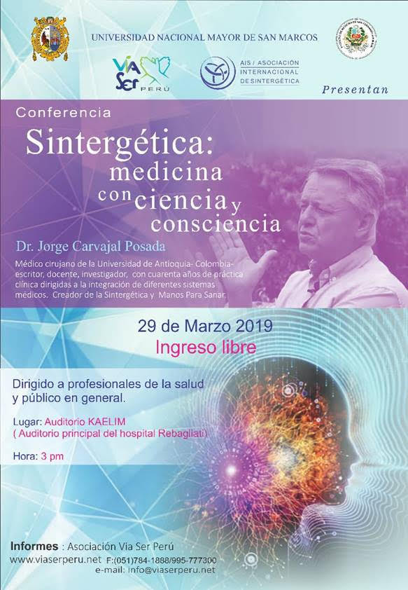 Brindará la conferencia Sintergética: Medicina con ciencia y consciencia con INGRESO LIBRE en el auditorio del Hospital Rebagliati el 29 de MARZO 2019 a las 3PM.ABIERTO AL PÚBLICO EN GENERAL. MÁS INFORMACIÓN EN LA PARTE INFERIOR DEL AFICHE PUBLICADO.