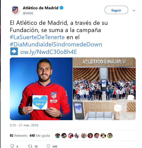 También el Atlético de Madrid, a través de su Fundación, se suma a la campaña #LaSuerteDeTenerte en el #DiaMundialdelSindromedeDown