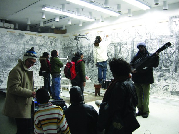 Tanto como la actividad de la línea ocupa el perímetro de la galería, también enfatiza la naturaleza del espacio que rodea y la conducta dentro de ese espacio. ¿Cómo nos manejaremos en apoyo de la línea? ¿De qué manera nuestras interacciones entre nosotros se verán afectadas por la tarea en cuestión y viceversa? ¿Qué otras formas de arte o actos creativos contribuirán a la sinergia de la línea?.