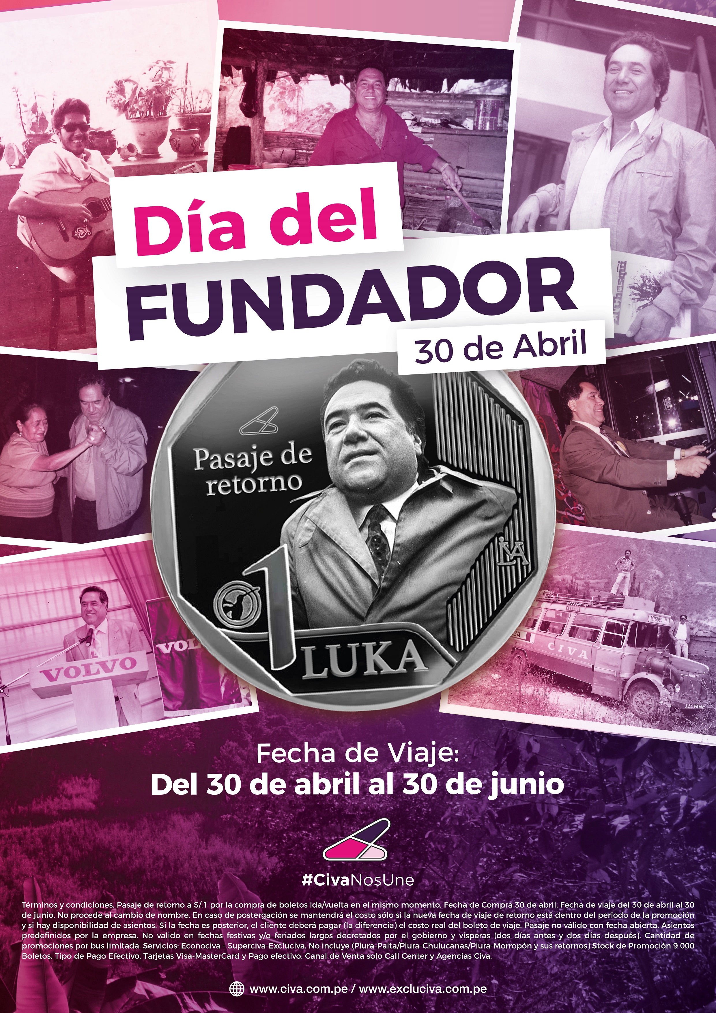 Los pasajes a un sol de CIVA se activarán nuevamente este martes 30 de abril con motivo de celebrar el aniversario del nacimiento de Miguel Ciccia Vásquez el legendario fundador de una de las empresas de transporte más importante del Perú.