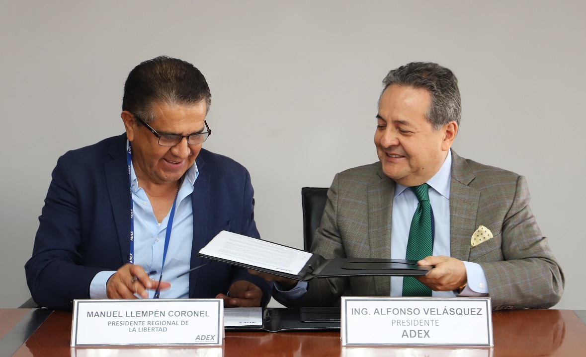 El presidente de la Asociación de Exportadores (ADEX), Alfonso Velásquez Tuesta y el Gobernador Regional de La Libertad, Manuel Llempén Coronel, suscribieron un Convenio Marco de Cooperación Interinstitucional, a fin de diversificar e incrementar las exportaciones con valor agregado de la región, con una visión de inclusión social productiva, sumando a los pequeños productores y a la agricultura familiar.