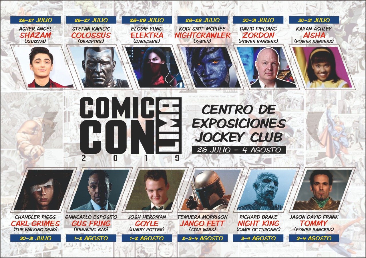 Después del anuncio de la llegada de estrellas del nivel de Asher Angel, coprotagonista de Shazam (Warner, DC), Temuera Morrison, conocido por sus papeles en películas como Star Wars, Aquaman y Green Lantern, Richard Brake actor que encarnó al Rey de la Noche de Game Of Thrones, Giancarlo Esposito, uno de los grandes de la serie Breaking Bad y Jason David Frank, el recordado Power Ranger Verde, hoy se anunció el cartel completo de artistas que visitarán Lima del 26 de julio al 4 de agosto.
