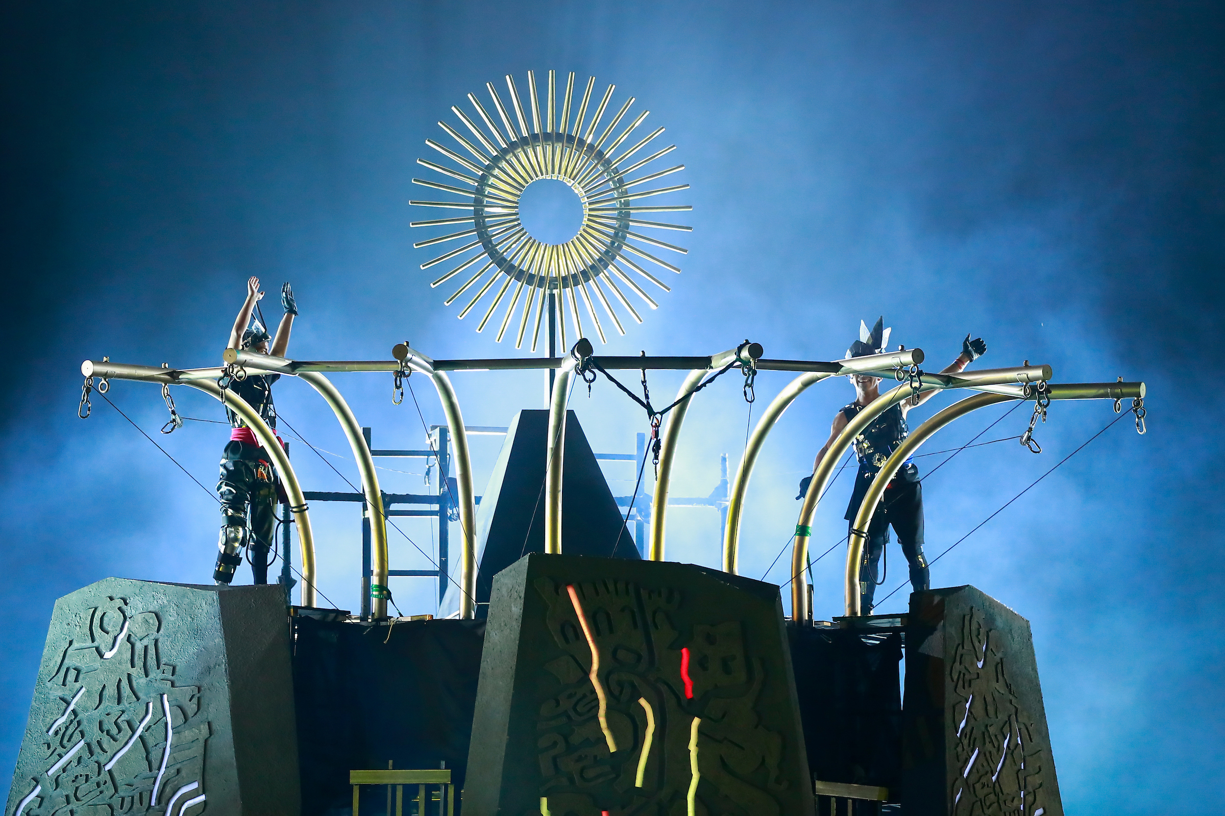 El factor externo, que en este caso se trataba de una catástrofe de la naturaleza con lava y fuego que amenaza sus vidas, artísticamente acompañada con acrobacias y siempre con las luces, los diseños y el vestuario que transportan al escenario de una época pre inca con los artistas voluntarios: 60 adultos y 8 niños, de los cuales 14 tienen alguna discapacidad.