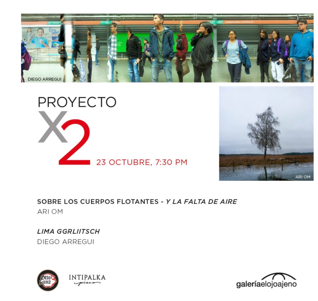 La muestra PROYECTO x2 es el resultado de la segunda convocatoria de la Galería El Ojo Ajeno para proyectos de exposición de los egresados de la Carrera Profesional de Fotografía del Centro de la Imagen. Se trata de un proyecto que busca dar visibilidad al talento y los intereses de los creadores visuales formados en el centro de estudios y también una forma de tomarle el pulso a la creación contemporánea en fotografía a través de una exploración de los intereses de estos jóvenes artistas. En esta segunda edición resultaron elegidos para la muestra Proyecto x2 los trabajos: Sobre los cuerpos flotantes -y la falta de aire de Ari Om y Lima ggrliitsch de Diego Arregui.