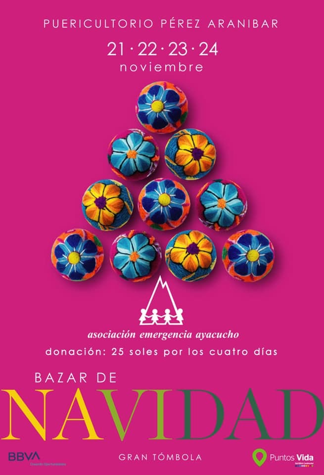 El XXX BAZAR DE NAVIDAD se llevará a cabo los días JUEVES 21, VIERNES 22, SABADO 23 Y DOMINGO 24 DE NOVIEMBRE de 10.30 AM. A 9.00 PM en el PUERICULTORIO PEREZ ARANIBAR, Av. del Ejercito 700, Magdalena