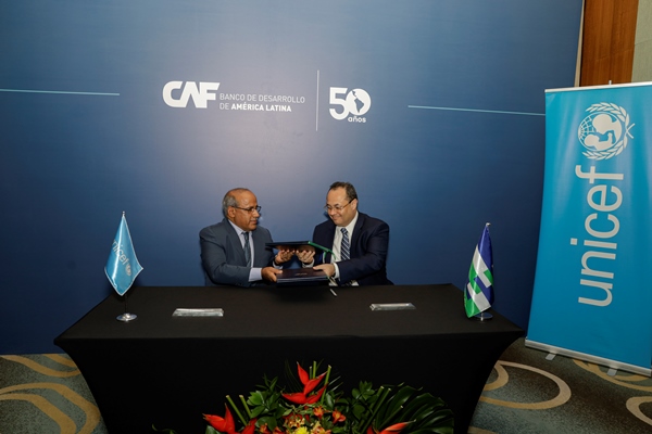 El banco de desarrollo de América Latina, CAF y UNICEF firmaron un Memorando de Entendimiento para fortalecer su colaboración en materia de primera infancia, de formación de jóvenes en las habilidades necesarias para la vida y de políticas sociales de protección social para la infancia y adolescencia. Este acuerdo tiene como propósito potenciar los avances de la región en la implementación de la Agenda 2030 y los Objetivos de Desarrollo Sostenible (ODS), con foco en el cumplimiento de los derechos de los niños, niñas y adolescentes.