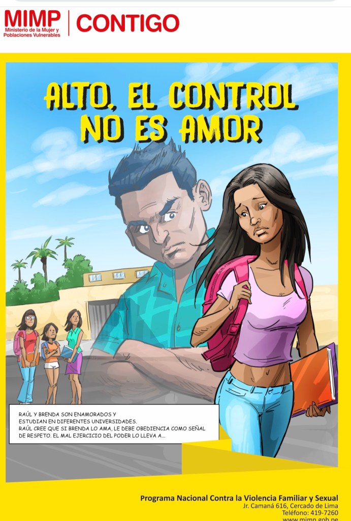 Historieta informativa del Ministerio de la Mujer y Poblaciones Vulnerables para dejar claro que una relación amorosa sana no tiene nada que ver con el dominio de una persona, en este caso, de la mujer. Llamada gratuita Línea 100 desde un teléfono fijo o celular para atender casos de violencia familiar y abuso sexual. El Ministerio de la Mujer y Poblaciones Vulnerables indica que la línea 100 es atendida por profesionales que derivan según sean los casos a los Centros de Emergencia Mujer u otras instituciones que atienden la problemática.
