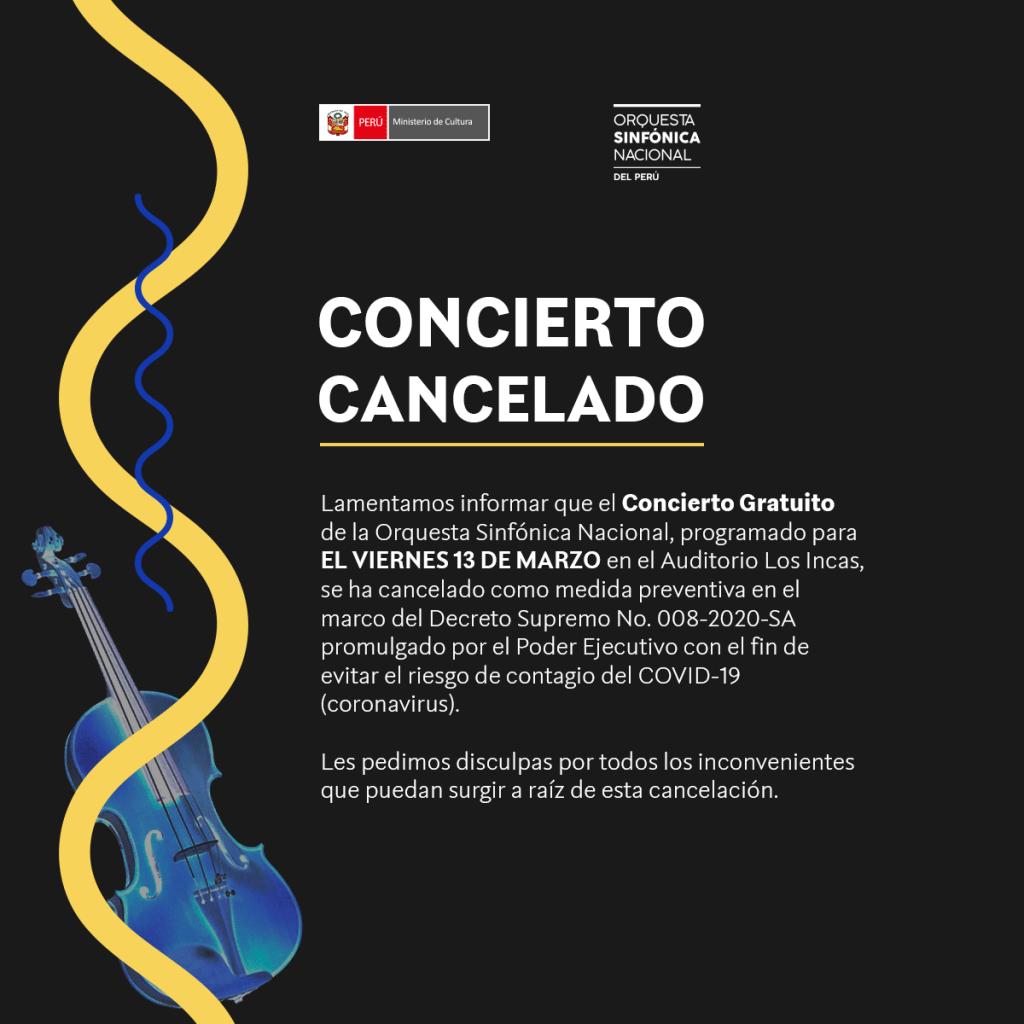 El Ministerio de Cultura del Perú informa la cancelación de los respectivos conciertos de la Orquesta Sinfónica Nacional Juvenil Bicentenario y de la Orquesta Sinfónica Nacional, programados para este jueves 12 y viernes 13 de marzo respectivamente, como medida de prevención en el marco del Decreto Supremo No. 008-2020-SA promulgado por el Poder Ejecutivo hoy jueves 12 de marzo 2020 para evitar el riesgo de contagio del COVID-19 (coronavirus).