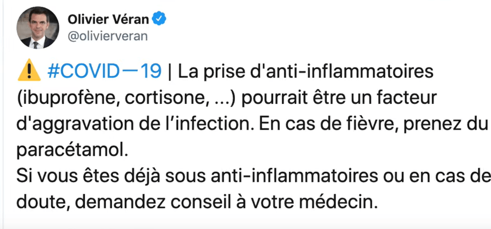 La alerta sobre la afirmación que el consumo de ibuprofeno podría agravar la condición del virus debido a una enzima de ese antinflamatorio y medicamentos similares, la emitió el ministro de sanidad francés, Olivier Véran, con referencia a la publicación de la revista médica inglesa The Lancet. La Agencia Española de Medicamentos y Productos Sanitarios, AEMPS, señaló que no tiene sustento científico hasta la fecha y el ministerio de sanidad español indica que los pacientes bajo tratamiento con ibuprofeno no deben interrumpirlo y recomiendan el paracetamol en caso de fiebre.