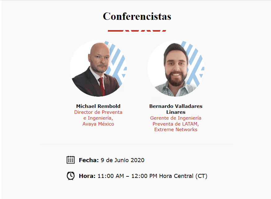 El Webinar con dos expertos de Avaya y Extreme Networks webinar ayudarán a los participantes a asegurar la colaboración de empleados y atención al cliente extendiendo la oficina a casa de manera rápida, ágil y segura a través de la aplicación de colaboración y reunión de equipo basada en la nube con mensajería, audio y videoconferencia, intercambio de archivos y más en la aplicación fácil de usar a la que puede acceder desde cualquier lugar.