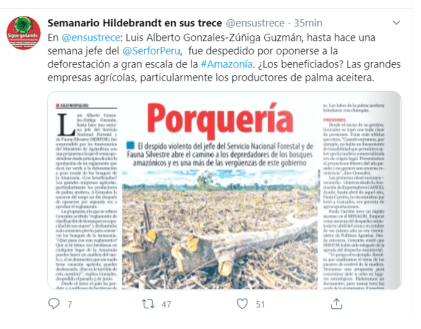 El semanario peruano Hildebrandt en sus Trece también reporta el despido de Gonzáles-Zúñiga, despedido por oponerse a la deforestación a gran escala en la Amazonía, beneficiando a las grandes empresas agricolas, particularmente a los productores de palma aceitera.