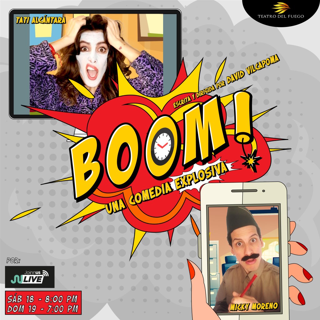 «Esta obra es una respuesta resiliente al golpe que recibieron las artes escénicas por causa de la pandemia. Para mí existe para decirle a todos que aún estamos aquí, y en lo personal para reafirmarme en mi vocación teatral. Escogí hacer una comedia porque creo que necesitamos reírnos más. El arte está para eso, para suplir aquellas carencias que generamos cuando automatizamos nuestra vida, más aún cuando lo hacemos por medio de la virtualidad. Bueno, entonces cojamos esta nueva realidad mediada y pongámosle un poco de sabor. Boom, es pura comedia, es una situación real llevada al extremo. No pretende experimentar con los límites difusos que se crean cuando llevamos el teatro a internet, cuando utilizamos recursos televisivos y poéticas cinematográficas, es demasiado pronto para eso. Primero, hay que establecer las convenciones más puras de lo que algunos han llamado ‘teatro de pandemia’ o simplemente ‘teatro remoto’. La primera será que ese público presencial que veía una obra desde la oscuridad de una sala ahora lo hará desde la privacidad de su espacio, dos formas distintas de ‘compartir’ un ‘estar presente’ porque no se les ha negado lo esencial, la actuación en vivo. Definitivamente algo se gana y algo se pierde, es lo lógico en todo ejercicio de transliteración. Boom, llega de la mano de dos grandes artistas que han probado su talento para la comedia en muchos escenarios limeños y que ahora han aceptado el reto de hacernos reír a la distancia. Agradezco a Tati y a Micky por aceptar este desafío y por creer que aún se puede seguir haciendo teatro».