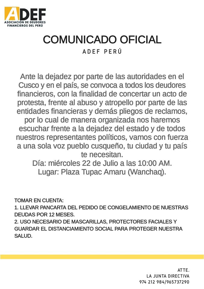 Este es el comunicado que han emitido para convocar a ciudadanos que hayan sufrido algún abuso por parte de entidades financieras. En este caso se dirigen a Cusco, Wanchaq.