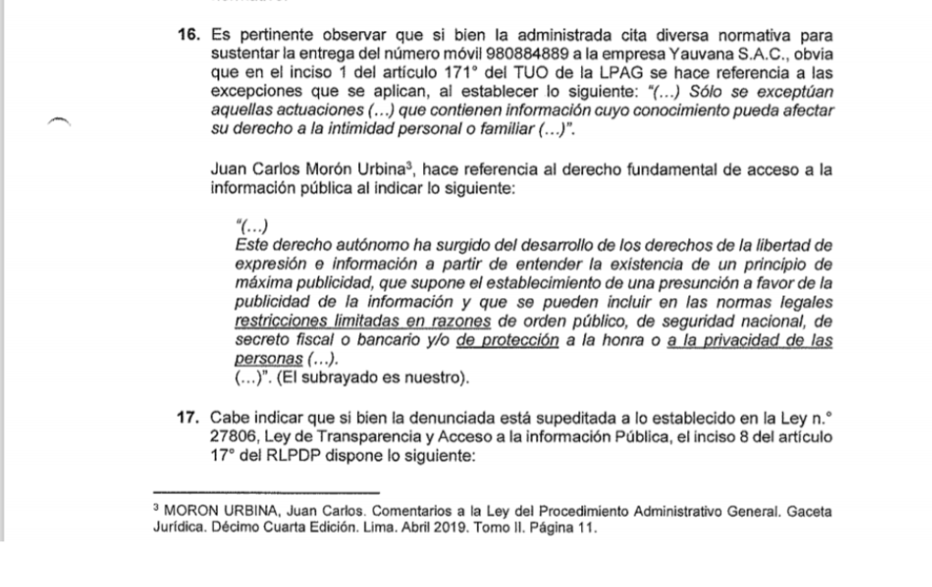Dicho informe de Fiscalización elaborado tras una acción presencial en atención a la denuncia presentada por el agraviado el 6 de junio de 2020, concluyó que la comuna miraflorina habría incumplido la obligación de confidencialidad, al haber facilitado el acceso a su número telefónico sin su consentimiento.