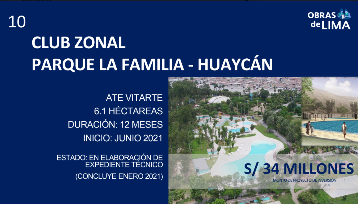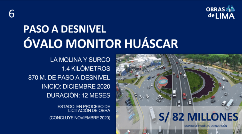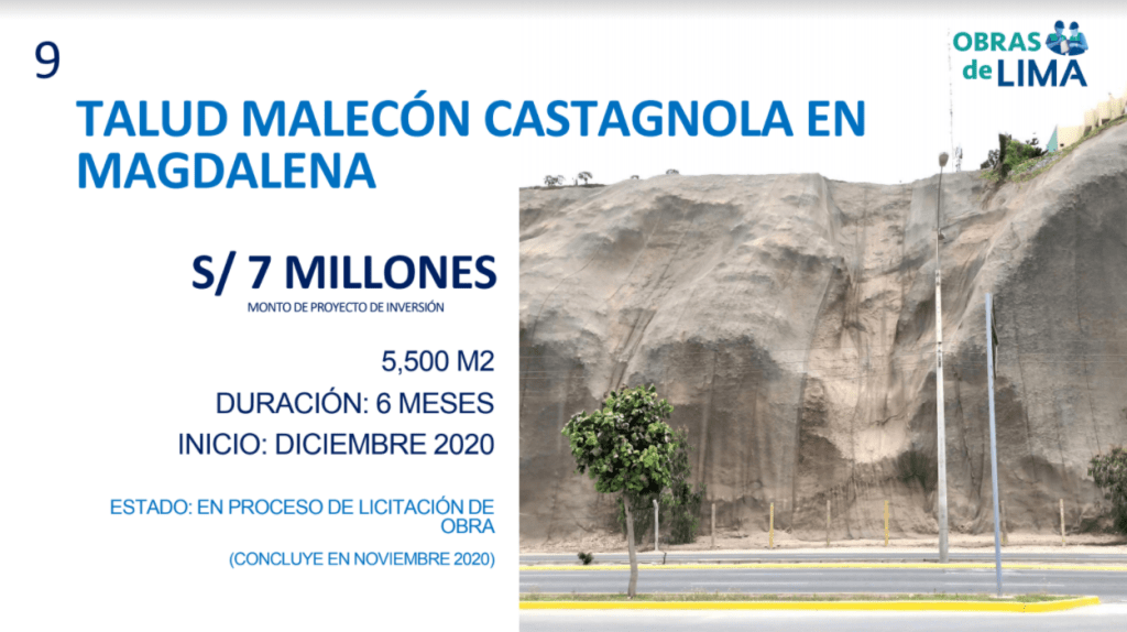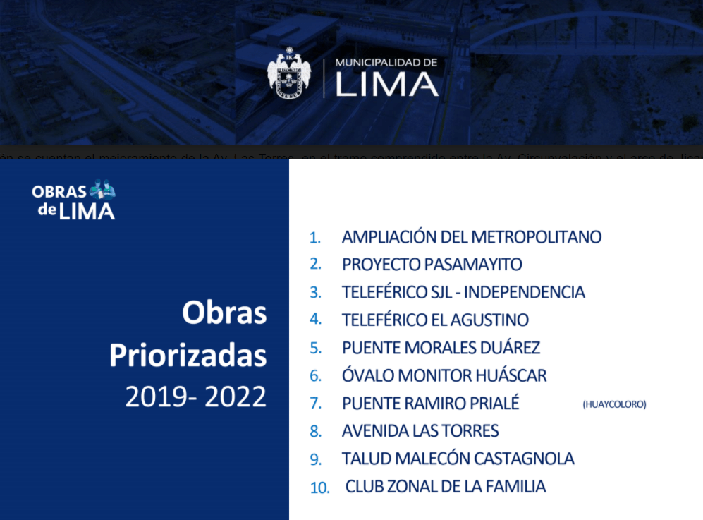 También se cuentan el mejoramiento de la Av. Las Torres, en el tramo comprendido entre la Av. Circunvalación y el arco de Jicamarca, en Lurigancho-Chosica, así como la estabilización de taludes en el malecón Castagnola, en Magdalena del Mar, la ejecución del paso a desnivel del óvalo Monitor Huáscar, el cual conectará La Molina y Surco, beneficiando a 506 mil ciudadanos, y el club zonal Parque de la Familia, de 6.1 hectáreas, en Huaycán (Ate),que beneficiará a 197 mil vecinos de esta zona de Lima.
