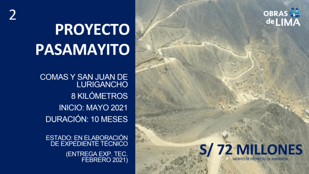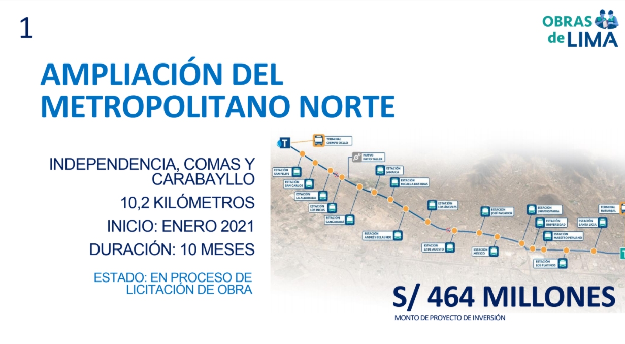 El alcalde Jorge Muñoz detalló que entre las obras se cuentan la ampliación norte del Metropolitano, que va de la estación El Naranjal a la Av. Chimpu Ocllo y favorecerá diariamente a 80 mil ciudadanos de Independencia, Comas y Carabayllo; así como el proyecto Pasamayito, el cual unirá los distritos de Comas y San Juan de Lurigancho a través de una vía de 8 kilómetros de extensión, que será usada por otros 80 mil habitantes.