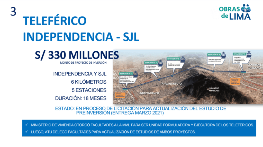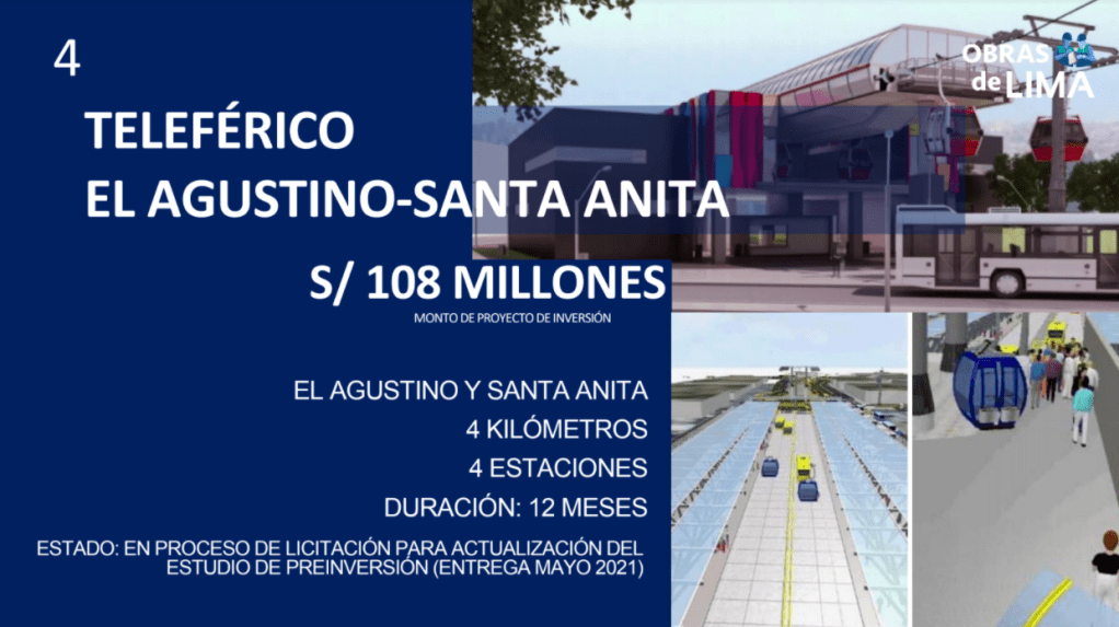 A la lista también se suman dos teleféricos: uno que conecta los distritos de Independencia y San Juan de Lurigancho, y otro ubicado en El Agustino y Santa Anita. Ambas obras beneficiarán a más de 27 mil vecinos.