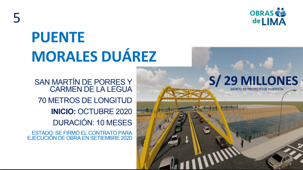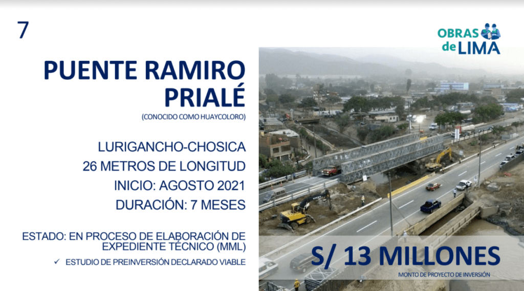 Asimismo, han priorizado el mejoramiento de la transitabilidad vehicular y peatonal en el puente Ramiro Prialé, conocido como Huaycoloro, con 26 metros de longitud, en Lurigancho-Chosica, con un alcance de cerca de 250 mil personas; de igual manera, la construcción del puente Morales Duárez, de 70 m de longitud, que unirá San Martín de Porres y Carmen de la Legua, favoreciendo a más de 100 mil limeños.