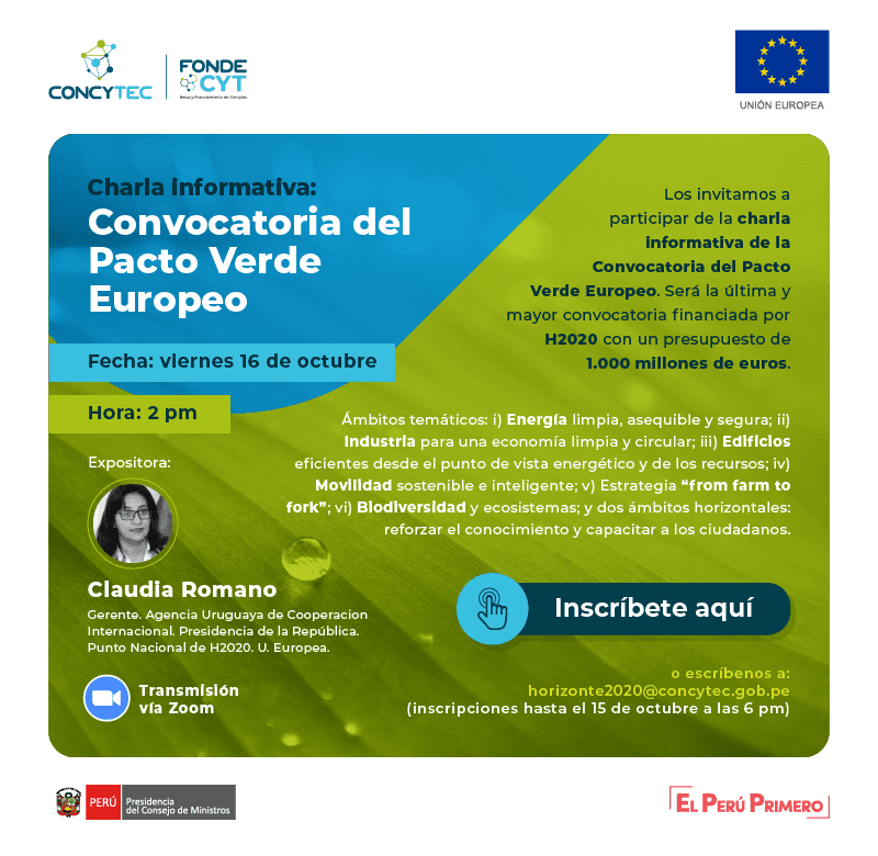 Convocatoria del Pacto Virtual Europeo: Charla informativa de 5 ejes temáticos con presupuesto de mil millones de euros Publicado el octubre 15, 2020 por chavezriveroclaudia Deja un comentario All Posts Inscripciones hasta el 15 de octubre a las 6 pm. Link para la conexión a través de Zoom Comparte esto:Compartir Compartir en X (Se abre en una ventana nueva) X Comparte en Facebook (Se abre en una ventana nueva) Facebook Enviar un enlace a un amigo por correo electrónico (Se abre en una ventana nueva) Correo electrónico Imprimir (Se abre en una ventana nueva) Imprimir Me gusta Cargando... Relacionado