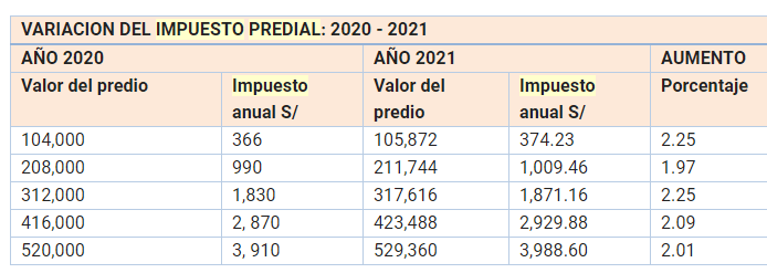 Para el próximo año, el impuesto predial de Lima Metropolitana tendrá un aumento promedio de 3%, con relación al impuesto pagado en el año 2020, estimó la Gerencia Legal de la Cámara de Comercio de Lima (CCL), conforme a los nuevos valores unitarios oficiales de edificaciones y los valores arancelarios de los terrenos, aprobados por el Ministerio de Vivienda, Construcción y Saneamiento, publicados el 30 de octubre en el diario El Peruano, según las Resoluciones Ministeriales 266, 267, 268, 269 y 270-2020-VIVIENDA.