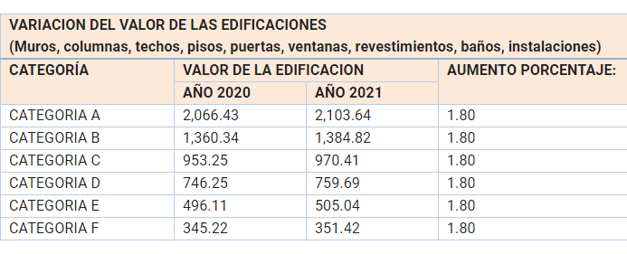 Los Valores Unitarios Oficiales de las Edificaciones de los predios tendrán un incremento de 1.80% en promedio en Lima Metropolitana y el Callao, que comprende valor por metro cuadrado de muros, columnas, techos, pisos, puertas, ventanas, revestimientos, baños e instalaciones, según lo dispuesto por la RM 270-2020-VIVIENDA.