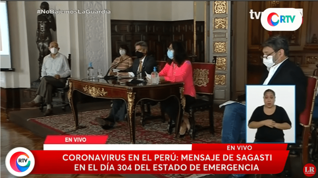 Mensaje de Francisco Sagasti y sus ministros en el día 60 de su gobierno transitorio y 304 del estado de emergencia en Perú: Mensaje con lenguaje enredado. con medidas que no funcionaron en la primera ola en el gobierno del presidente vacado Martín Vizcarra y con una conferencia de prensa restrictiva »Si un periodista hace más de una pregunta, nosotros escogemos cuál contestar», dice Sagasti ante una pregunta incómoda, claro a las que no eran incisivas agradecía por haberlas formulado. Del minuto 21:52 al 21:57. Entre la sinrazón de las medidas, se encuentran determinar el aforo en departamentos con nivel de alerta muy alta: Restaurantes en zonas internas (lugares cerrados): 40% donde los asistentes tienen que sacarse la mascarilla y Templos y lugares de culto donde todos escuchan por 30 minutos portando sus mascarillas sólo pueden ingresar: 10% de la capacidad del lugar.