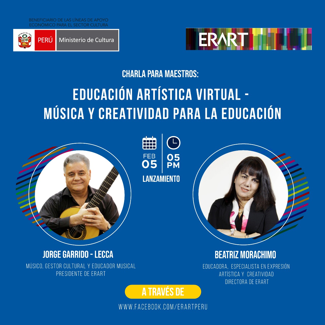 ¿Cómo enseñar arte en la virtualidad?, ¿cuál es la importancia de la enseñanza del arte en las escuelas? Éstas y otras interrogantes serán analizadas en la conferencia “Educación Artística Virtual. Música y creatividad para la educación”, a cargo de Beatriz Morachimo (Educadora, especialista en expresión artística y creatividad. Directora de ERART) y de Jorge Garrido Lecca (Músico, gestor cultural y educador musical Presidente de ERART). La charla gratuita es dirigida a maestros y padres de familia, es parte de las actividades programadas alrededor del libro virtual de partituras y tablaturas «5 Para Guitarra» de Garrido Lecca que cuentan con el auspicio del Ministerio de Cultura. La charla está programada para este viernes 5 a las 5 p.m. y se difundirá a través de la cuenta Facebook de ERART.