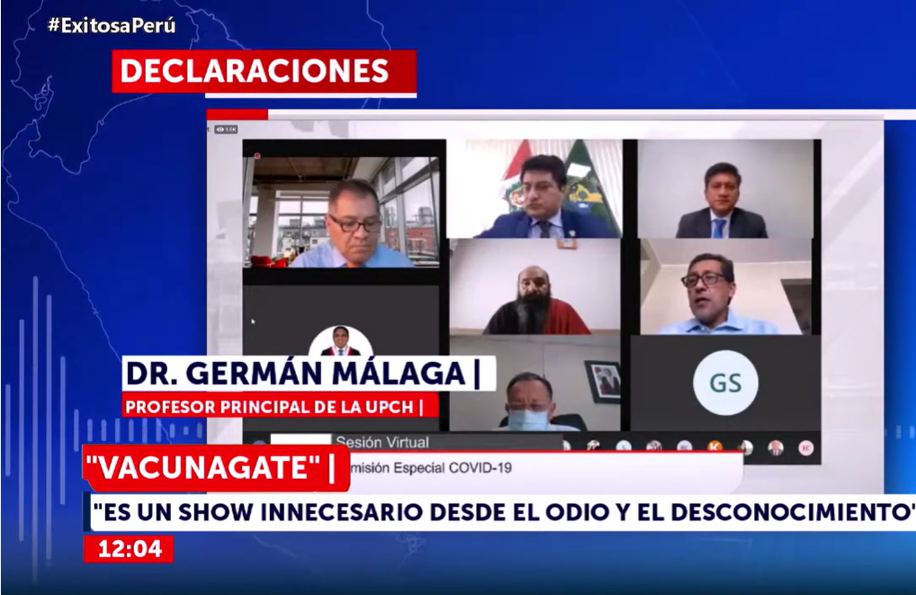A LA COMISIÓN ESPECIAL COVID 19 DEL CONGRESO DE LA REPÚBLICA DEL PERÚ, VÍA ZOOM, EL DOCTOR GERMÁN MÁLAGA, RESPONSABLE DE LOS ENSAYOS CLÍNICOS DE LA VACUNA CHINA SINOPHARM EN LA UNIVERSIDAD PERUANA CAYETANO HEREDIA DIJO QUE EL DESTAPE DE FUNCIONARIOS INMUNIZADOS ANTES QUE EL PERSONAL DE SALUD EN PRIMERA LÍNEA QUE TRABAJAN CONTRA EL COVID 19, ES UN SHOW INNECESARIO DESDE EL ODIO Y DESCONOCIMIENTO.