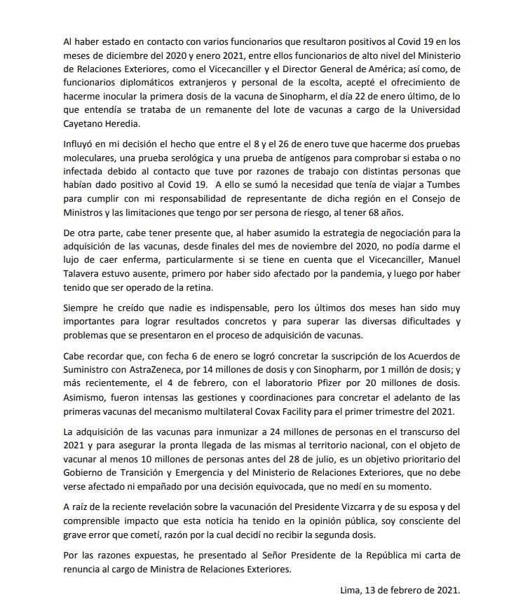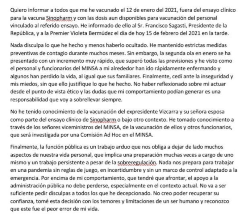 «Quiero informar a todos que me he vacunado el 12 de enero del 2021 fuera del ensayo clínico para la vacuna de Sinopharm y con las dosis aún disponibles para vacunación del personal vinculado al referido ensayo».