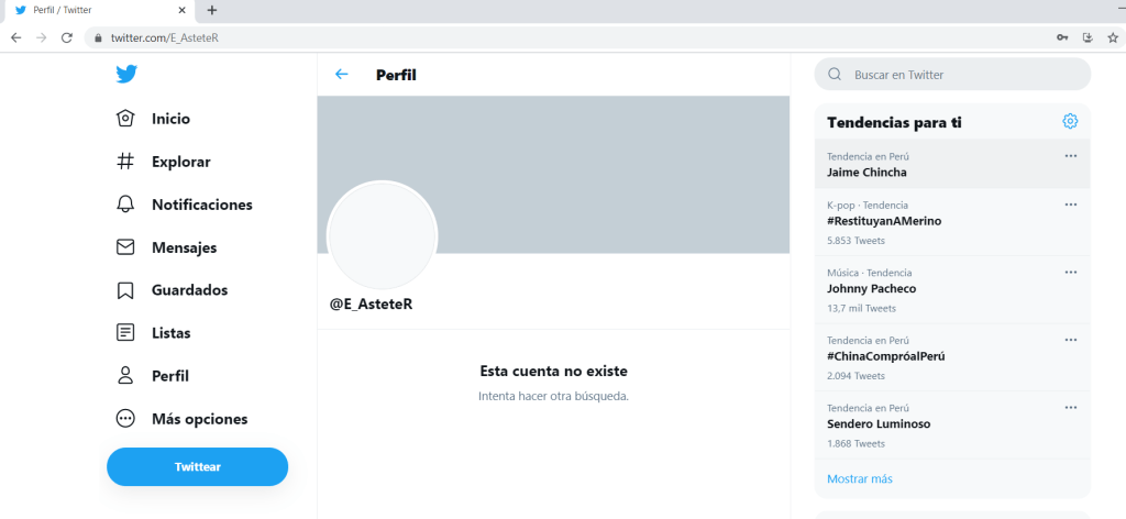 La ex ministra Esther Elizabeth Astete Rodriguez borró su cuenta de Twitter: E_AsteteR;