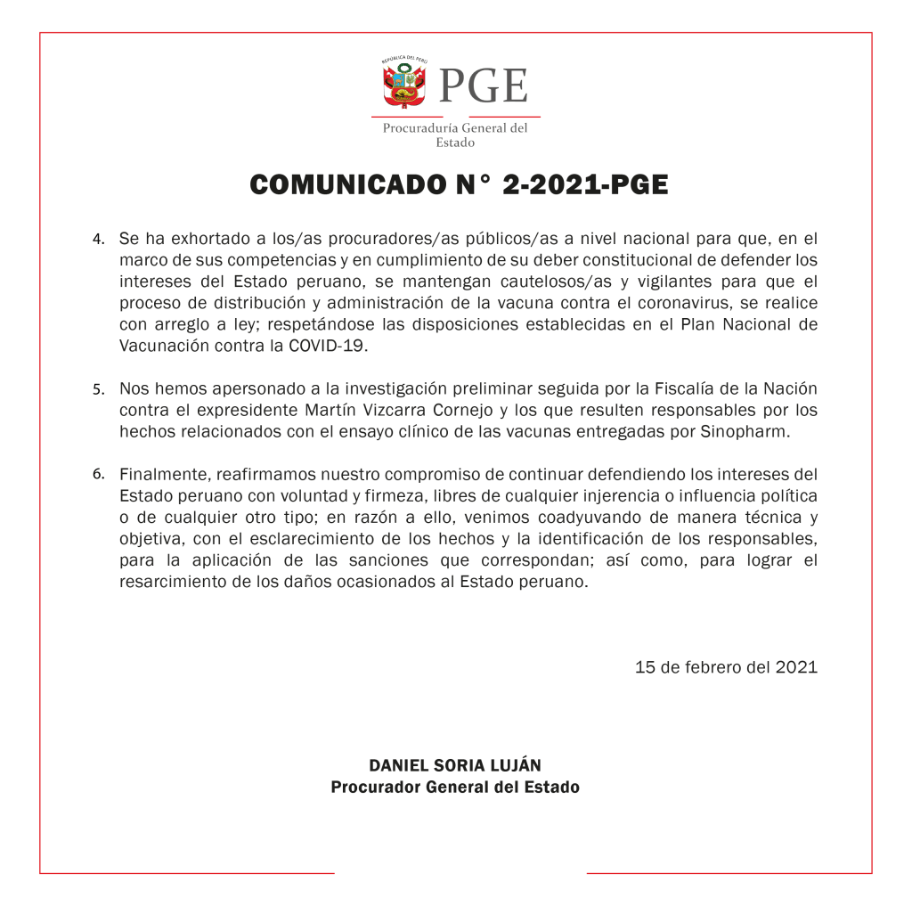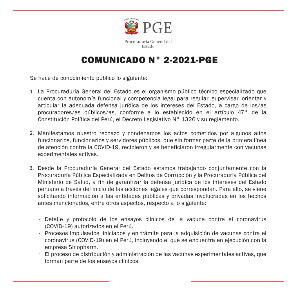 Comunicado de la Procuraduría General del Estado de Perú por el escándalo de la vacunación ilegal de funcionarios, antes que la población peruana y sobre todo personal sanitario trabajando esforzadamente en primera línea: