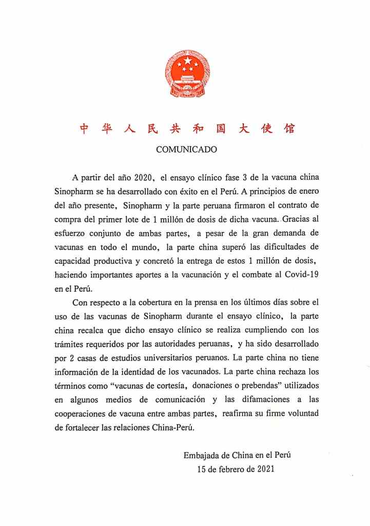 La Embajada de China en Perú rechaza haber ofrecido “vacunas de cortesía” en alusión a una prebenda cuando se ha confirmado por la boca de ellos mismos el ex presidente vacado Martín Vizcarra y la ex ministra de Relaciones Exteriores, Esther Elizabeth Astete Rodriguez *Y la noche del lunes 15 de febrero 2021, la propia ex ministra de la salud, Pilar Mazzetti.