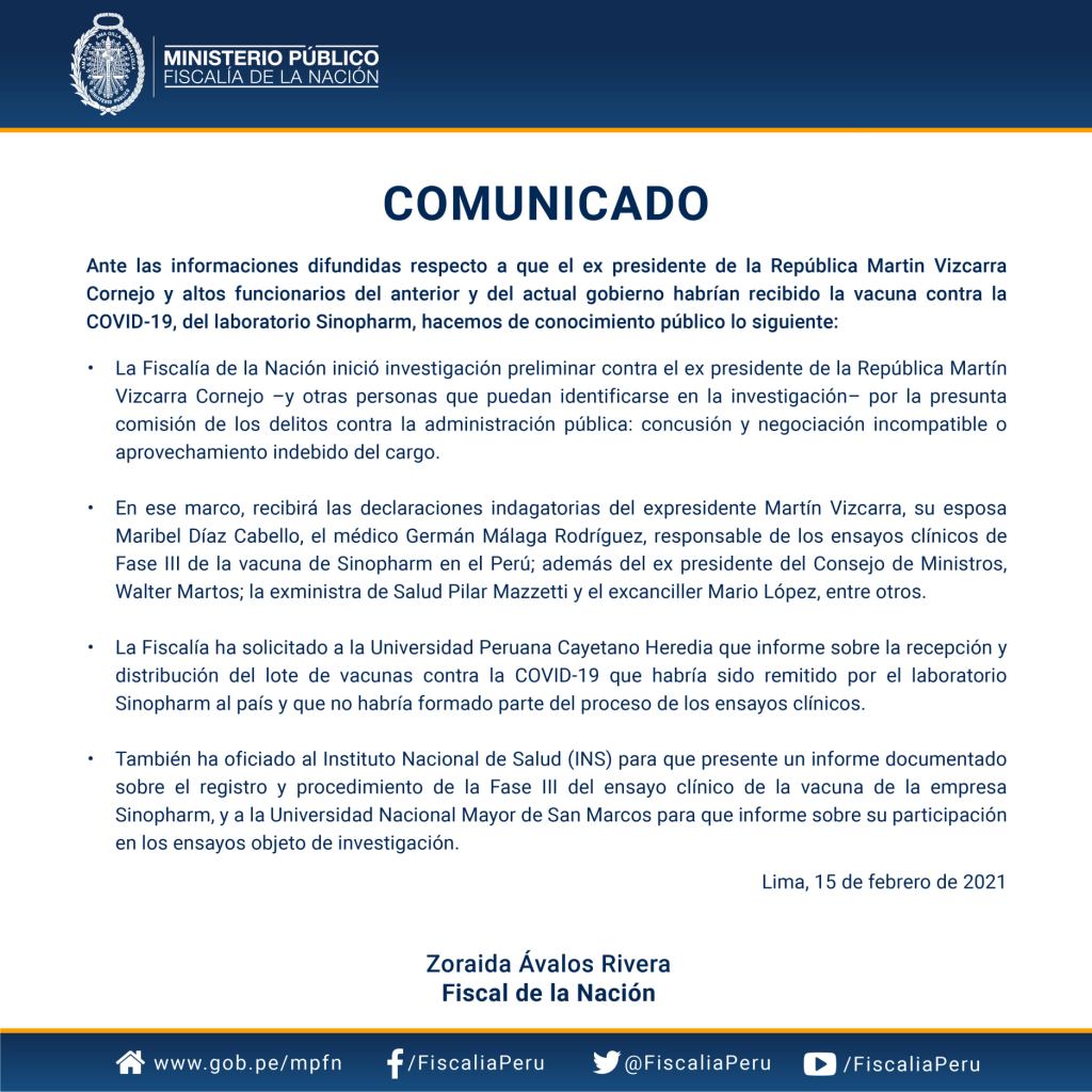 Comunicado de la Fiscalía de la Nación sobre el inicio de la investigación preliminar al expresidente vacado Martín Vizcarra y otros funcionarios del actual y anterior gobierno que habrían recibido la vacuna contra la COVID-19: