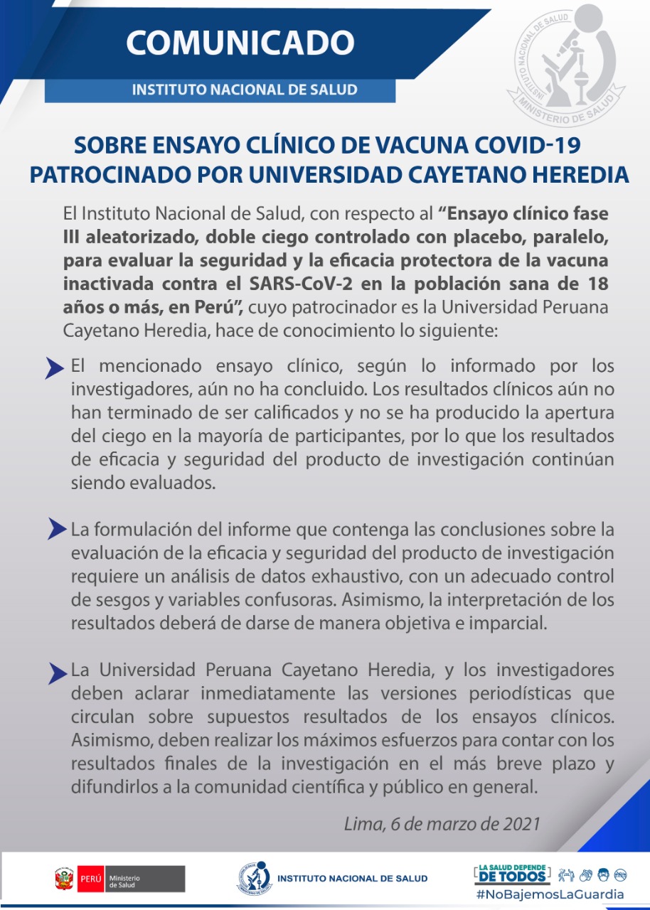 ACTUALIZACIÓN 6 DE MARZO 2021: CONFERENCIA DE PRENSA DE LA PRESIDENTA DEL CONSEJO DE MINISTROS, VIOLETA BERMÚDEZ, RESPECTO A LA DENUNCIA HECHA EN EL PROGRAMA BETO A SABER SOBRE LA EFECTIVIDAD DEL 11% Y 33% LOS ENSAYOS CLÍNICOS DE LAS VACUNAS DEL LABORATORIO CHINO SINOPHARM EN PERÚ REALIZADOS EN LA UNIVERSIDAD PRIVADA CAYETANO HEREDIA; RECHAZÓ ESA DENUNCIA QUE CALIFICÓ COMO IRRESPONSABLE. EN OTRO MOMENTO, AL SER PREGUNTADA, CONTRADICTORIAMENTE DIJO QUE NO NIEGA, NI AFIRMA LA AUTENTICIDAD DEL DOCUMENTO MOSTRADO EN EL REFERIDO PROGRAMA TELEVISIVO. AÑADIÓ QUE ESO TIENE MOTIVOS POLÍTICOS PARA DESESTABILIZAR LAS ELECCIONES DE ABRIL EN EL PAÍS. TAMBIÉN DIO COMO ARGUMENTO QUE EL GOBIERNO NO TIENE INJERENCIA DIRECTA EN LA U. CAYETANO. NUNCA MENCIONÓ EL INTERÉS DEL GOBIERNO PARA REALIZAR UNA INVESTIGACIÓN EXHAUSTIVA, POR EL CONTRARIO POR ADELANTADO INICIALMENTE DIJO QUE TODO ES FALSO. SÓLO MENCIONÓ QUE EL INSTITUTO NACIONAL DE SALUD DEL PERÚ SE PRONUNCIÓ EN UN COMUNICADO Y HA PEDIDO EL ESCLARECIMIENTO DEL CASO. SIN EMBARGO. BERMÚDEZ DIJO QUE SU GOBIERNO CREE EN LA LIBERTAD DE EXPRESIÓN, PERO TODO TIENE SU LÍMITE, POR ESO SE REMITEN AL MINISTERIO DE JUSTICIA, EN ALUSIÓN AL PROGRAMA BETO A SABER Y EL CANAL QUE NO PRONUNCIAN.