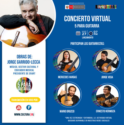 Para cerrar las actividades en torno al libro «5 para guitarra» de Jorge Garrido Lecca, este sábado 27 de marzo a las 7 p.m. se realizará un concierto con la participación de los maestros guitarristas Mercedes Vargas, Jorge Vega, Mario Orozco y Ernesto Hermoza quienes interpretarán las obras del reconocido autor, las mismas que se encuentran en la mencionada publicación. El concierto será difundido a través del Facebook e Instagram de ERARTPERU.