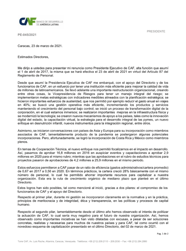También en su carta, sostuvo que su renuncia «evitará la politización de nuestra querida y tan necesaria CAF» Destacó los logros de su gestión y sobre el CAF dijo que »es una de las pocas historias de éxito de la integración regional» en América Latina, porque sus miembros «apoyaron el fortalecimiento patrimonial y mantuvieron su independencia institucional».