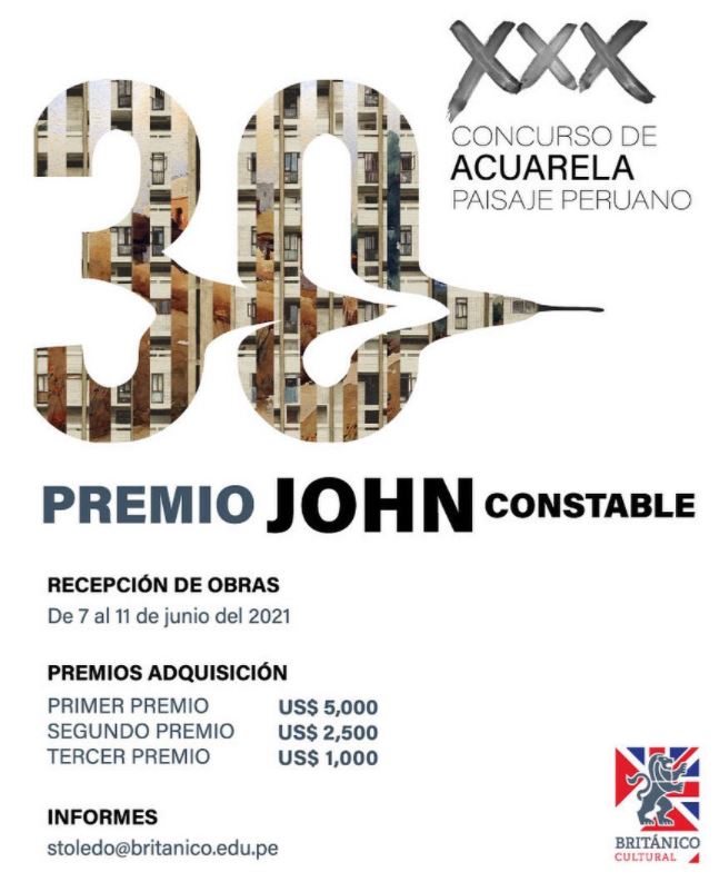 El Británico Cultural abre al público la convocatoria de la XXX edición del concurso de acuarela “Paisaje Peruano. Premio John Constable”. La recepción de obras será del 07 al 11 de junio y podrán participar artistas peruanos y extranjeros residentes en Perú. Las obras ganadoras serán elegidas por un jurado especializado.