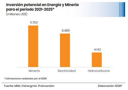El Instituto de Economía y Desarrollo Empresarial (IEDEP) de la Cámara de Comercio de Lima (CCL) ha identificado que el Perú cuenta con una cartera de 39 proyectos mineros – energéticos estimados en más US $25.000 millones para el período de 2021 -2025.