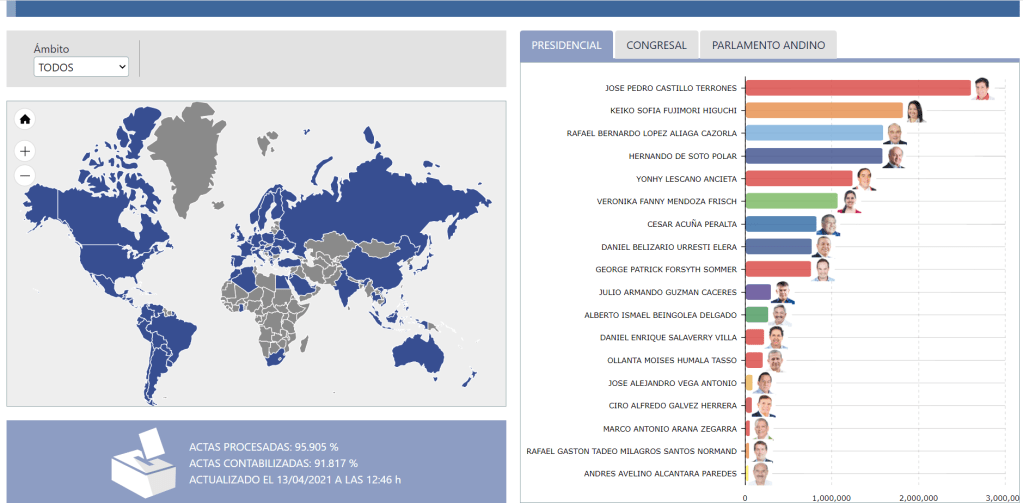 Al 95.905% del total de actas procesadas de las elecciones generales Perú 2021 en el país y en el exterior actualizado el martes 13 de abril 2021 a las 12:46 pm., la segunda vuelta será con Pedro Castillo de izquierda extrema y Keiko Fujimori de derecha popular con ausentismo de 27% de electores, denuncias de alrededor de 30 mil votos aprox. perdidos por mesas cerradas en el exterior como Canadá y Estados Unidos en los estados de New York y New Jersey.